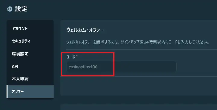 当ページのリンクから登録すると、自動的にウェルカムオファー欄に『CASINOATLAS100』が入力されているはずです。もし入っていない場合は、入力してください。
