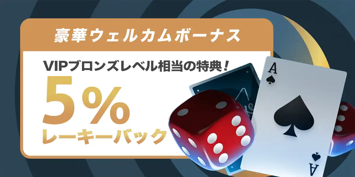 当サイトからステークカジノに新規登録すると、通常はVIPブロンズ・レベルのメンバーだけがもらえる特典『5%レーキバック』が、すぐに適用されます。